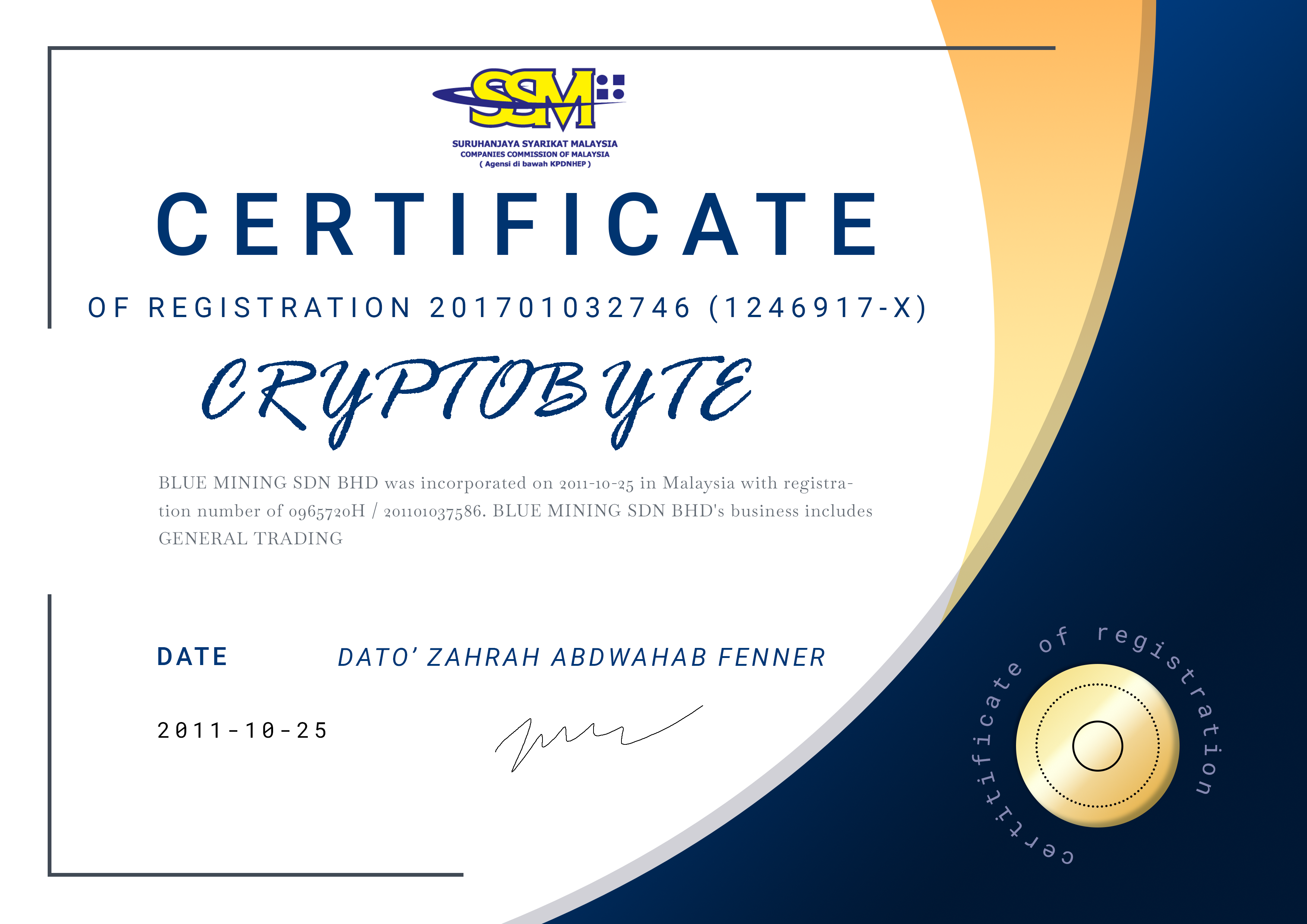 CRYPTOBYTE LTD is an officially registered company operating under the laws of Malaysia. Our certificate of registration confirms our full legitimacy and compliance with financial and corporate regulations. We believe that transparency is the key to trust, which is why we provide our clients with open access to our legal information, guaranteeing the reliability and lawfulness of all operations.